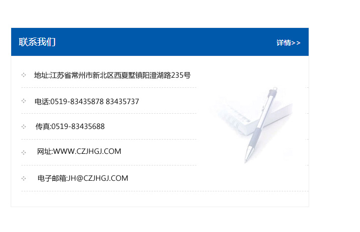 地址:常州市新北區友邦商務大廈1幢16、17層  電話:0519-85101652  傳真:0519-85112595  郵編:213022  網址:www.cz-jiayue_cn.qsxysy.com  郵箱:xiajifengaa@163.com